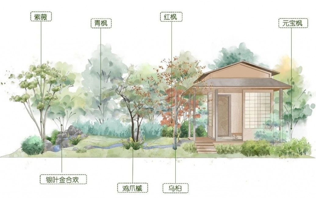 小院用三兩步汀步,一潭清水,搭配起伏的地形,融入自然的一花一草,一石一木,營造山水相依,小橋流水,草木為伴的靜謐空間。