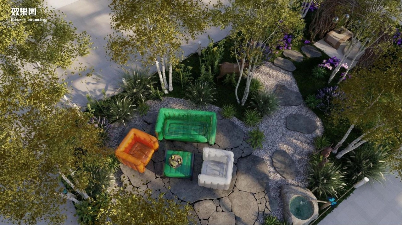藍紫色系自然花境圍抱的花園空間,品銘、交流、傳遞花園靜好時光,魚兒在坐椅里自由游動,由自然山石組成的小空間里,薄霧渺然,聆聽風過樺林,靜看花開花落……