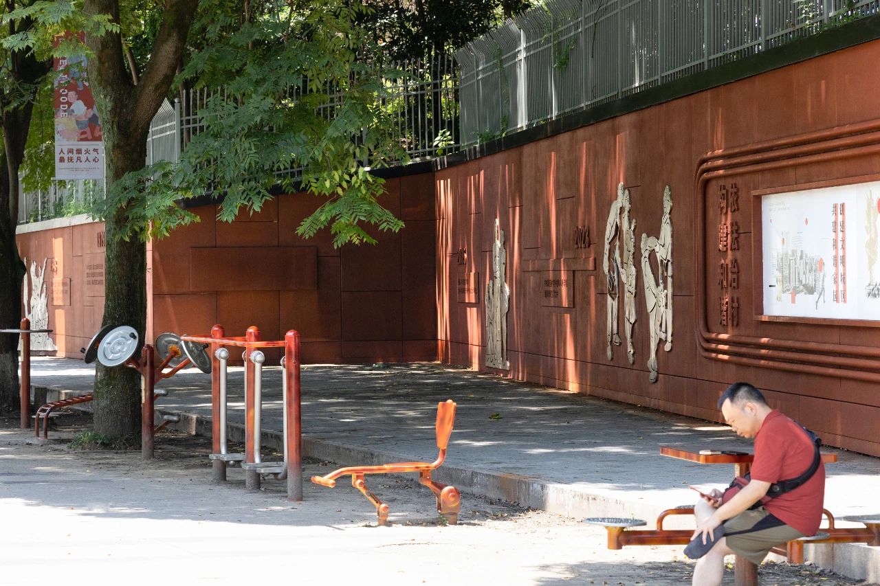 龍井公園地處龍井村核心地區,緊鄰廣益中學和農貿市場,承載著居民日常休閑活動,是龍井村更新提升中重要的一環。設計通過更新場地的功能設施,增設文化景墻、休閑健身設施、公共休閑座椅,有效提升了公共空間的美觀度、舒適性與便利性。改造后,人們在濃厚的文化氛圍里活動休憩,瀏覽文化墻上篆刻的過往,歷史的記憶與現在的生活相呼應,形成動人的空間記憶。