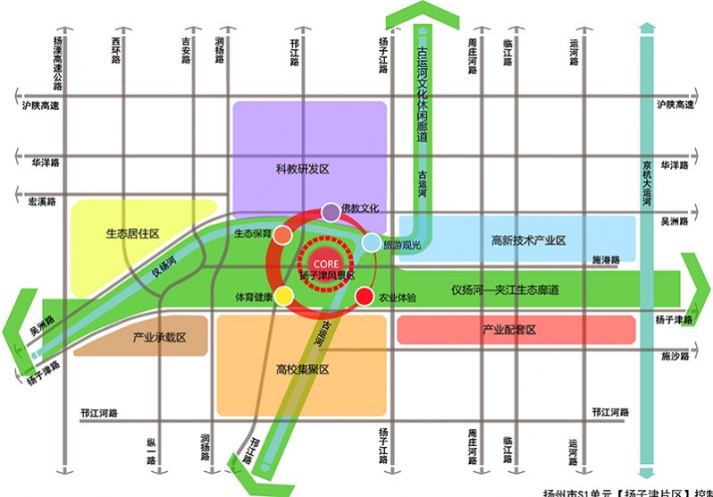 項目位于揚州開發區境內,總面積面積約13.03平方公里。規劃形成“一心引領,兩廊交織,六區協同”的空間結構,配合“以教督產,以產興城,生態支撐,多元配合”的發展策略,確定揚子津片區的定位為:長三角的人才輸送基地、揚州市智力集聚高地、揚州南部的城市生態休閑中心。