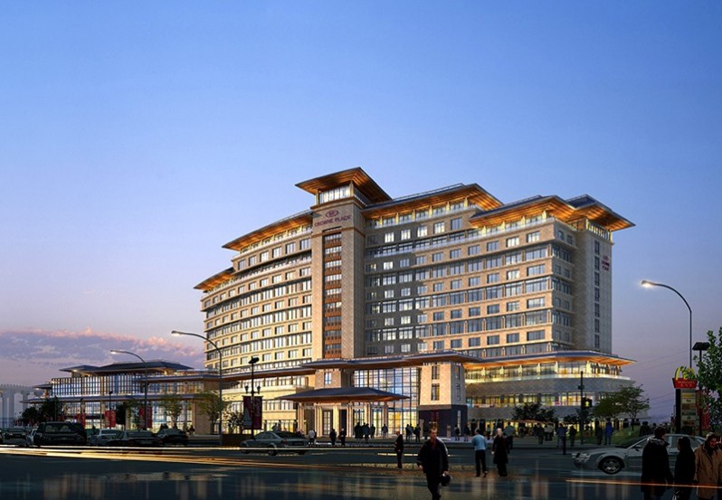 項目位于江蘇省揚州市,北臨文昌大橋,西臨京杭大運河,南臨湖濱規劃道路,東靠京杭路,是揚州廣陵新城“京杭之心”規劃區域內重要的建筑。揚州市東部,北臨文昌大橋,西臨京杭大運河,南臨大湖,東靠京杭路。項目利用基地內的多種自然條件和景觀優勢,平面布置呈東西走向,沿南側水體弧線舒展布局,使景觀價值在每間客房得到充分的體現,按照廣陵新城的規劃設計理念,建筑與湖心形成向心關系,體現出完整的的濱水空間,創造豐富的親水體驗。建筑立面風格,端莊氣派,立面設計成三段式的處理,建筑底部為石材面飾,彰顯氣派厚重感;中間為虛實對比的分層條窗,頂部為簡約的坡屋頂,整體建筑極具現代感又不失對地域文化的詮釋。