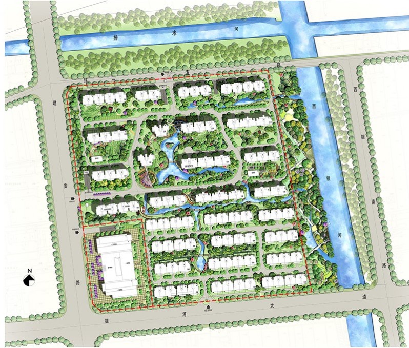 本地塊位于揚州市西南分區,寧通高速與建安路交叉口的東南角。北至規劃緯五路,南至銀河大道,西沿建安路,東側為西銀河及沿河景觀帶??偨ㄖ娣e16.41萬平方米。在總體的空間布局上,建筑由疊加洋房住宅和小高層住宅組成,整體上形成了南低北高的建筑態勢。并以一條景觀水系將兩者適當分隔。立面風格上以新古典風格為基調并融入揚州傳統建筑的元素,強調簡潔明快的色彩效果。建筑形式和色彩與周圍環境協調,并盡力打造良好的沿建安路,銀河大道的城市界面。